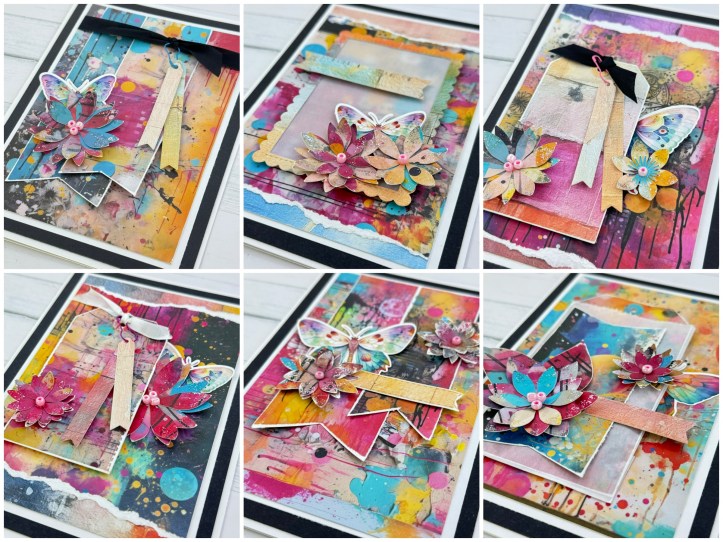 I have made 2 card collections so far, the first one is called Painter’s Magic and it uses a 12×12 paper pack called Paint Splatter & an 8.5 x 11 pack called Texture Rainbow. The second kit is called Butterfly Garden and is unique in that it uses their March Month Kit which is exclusive to March, and not available after that. You can click on any of the images below to shop that product.
